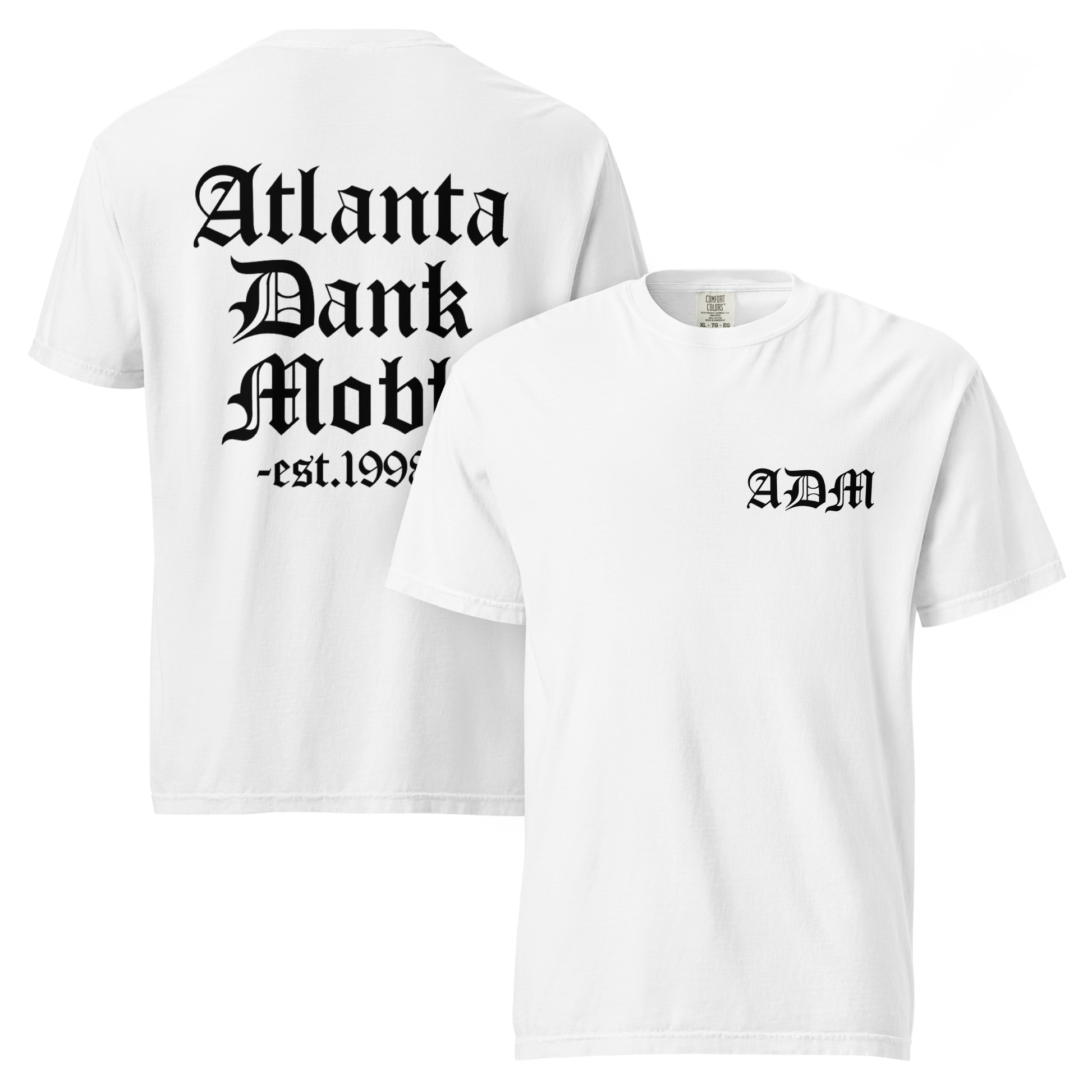Old English ADM T shirt printed on heavyweight comfort colors shirt. White colorway.